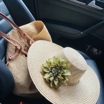 ラフィア素材の帽子は 形もシンプルでつばも広いので、エレガントなお洋服にも、カジュアルなお洋服にもどちらにも合わせやすく、しかも日傘が苦手な私には日よけ効果もバッチリで