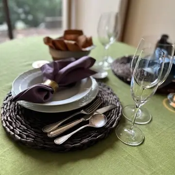 若草色のリネンのテーブルクロスに