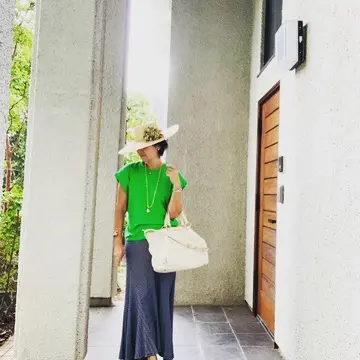 トップス/ZARA スカート.帽子/polo Ralph Lauren バッグ/miumiu サンダル/CAMPER バロックパール/Maris ネックレス.時計/BVLGARI バングル/ゴールドアンドバウンシー コサージュ/ヒロナルセ