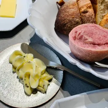 パンはフランンボワース、自家製酵母パン、リュスティックの3種類、ハーブバターや、2種類のオーガニックチーズもあり