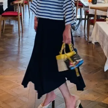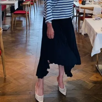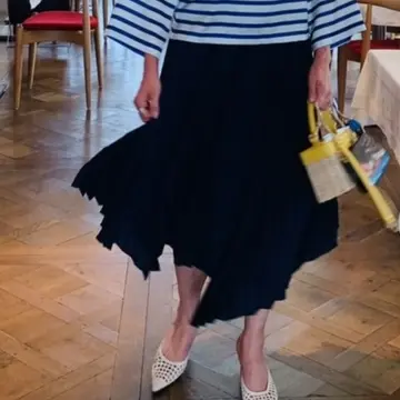 裾のカットがエレガントなプリーツスカートを合わせてエレガントなカジュアルスタイルに❤️