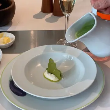 そのイチゴの上に焼いたメレンゲ、その上にバジルとライムのソルベを絞り、