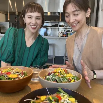 ランチをしたtasuさんの前で ベージュ✖️グリーンコーデなわたしたち