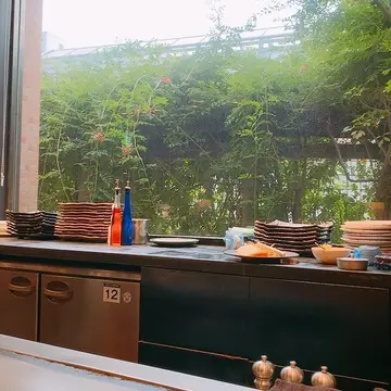 目の前にシェフ、その後ろは、緑が綺麗でした。