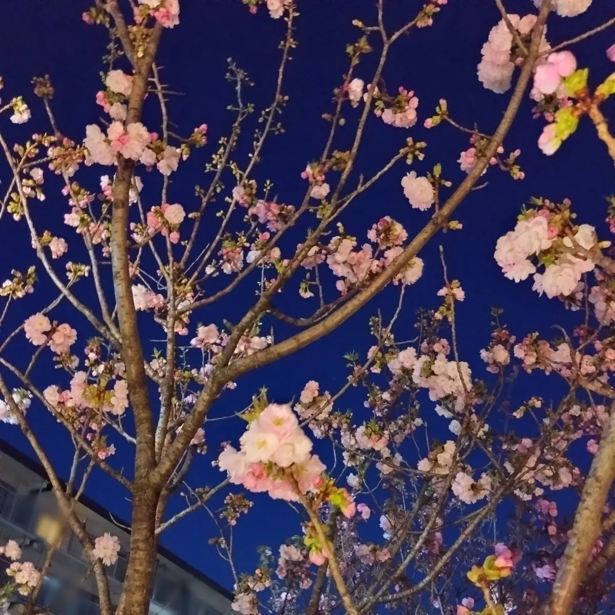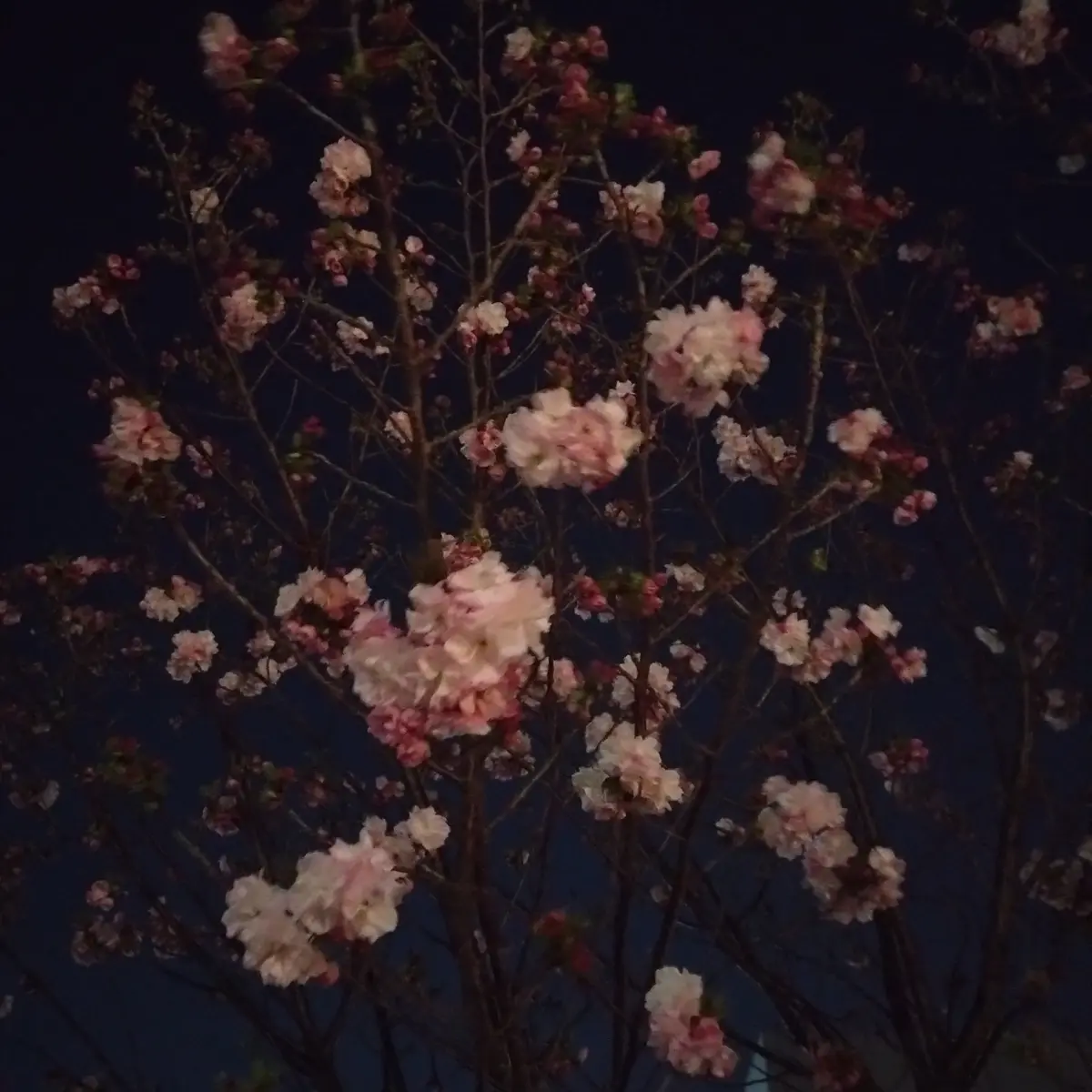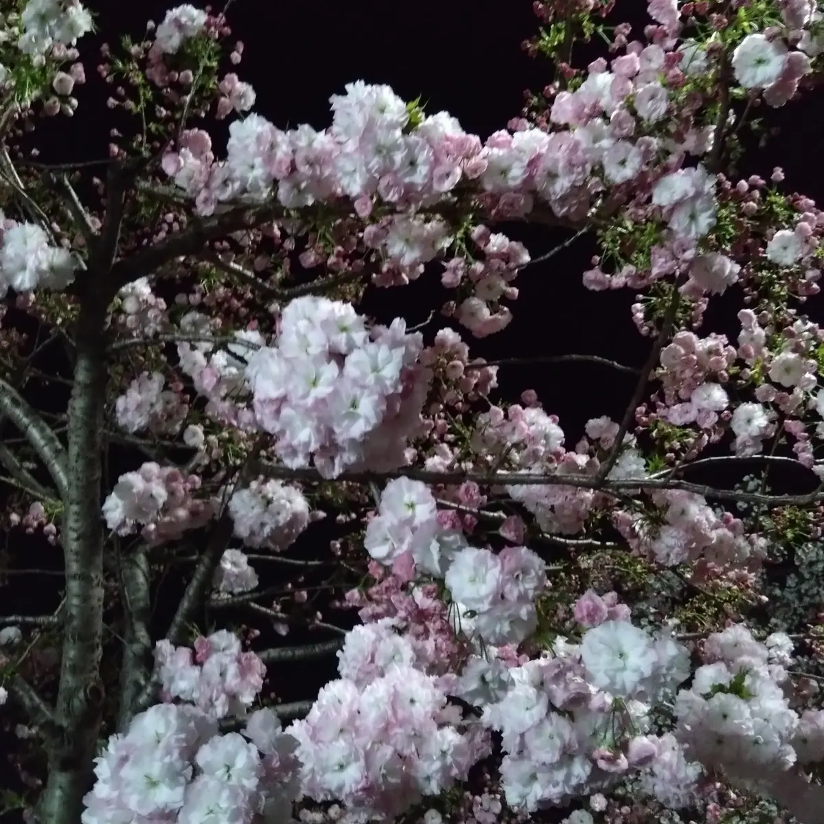 同じ品種の桜が並んでいるわけではないので、夜も近くで見るとピンクが濃い桜や白っぽい桜、花弁が多い桜etc..色々あるのが分かります。