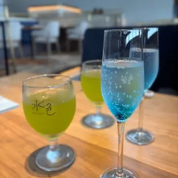 色がとっても綺麗~っ。水色の文字が入ったグラスは、お茶でした♪