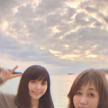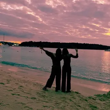 ホテル前の海で少しお散歩~雲り空でしたが夕日を眺めながら 友達とツーショット(*^。^*)