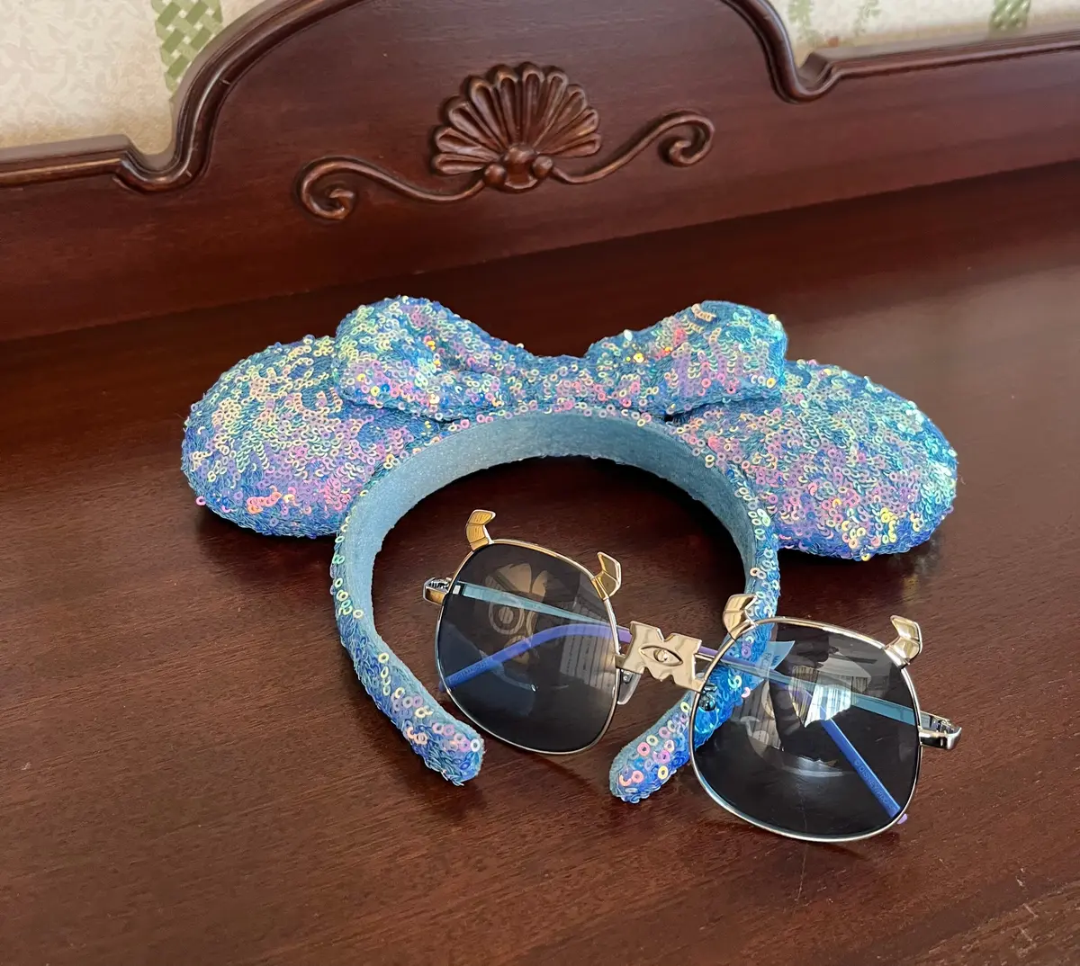 落ち着いた青味のあるトップスに、キャラクターカチューシャやサングラスで水色をプラスしてコーディネートに取り入れました😎🩵