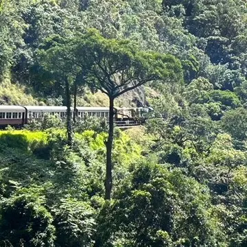 カーブ時に、車窓から見える、熱帯雨林中を100年以上歴史のある木製車両が走る姿が美しい