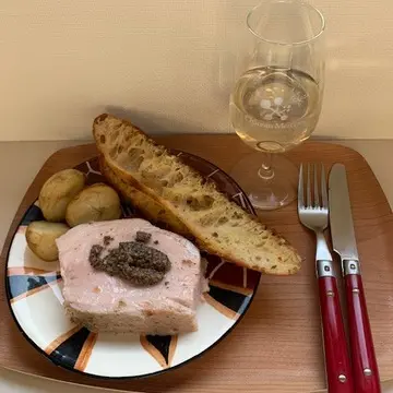 今日からの三越フランス展で買ってきたお惣菜をランチに。低温調理ローストポークの上にトリュフソース