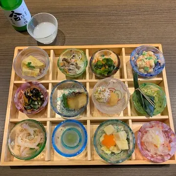 野菜おばんざい12種+ゆば丼かドリンクを選べたので、昼からお酒チョイス