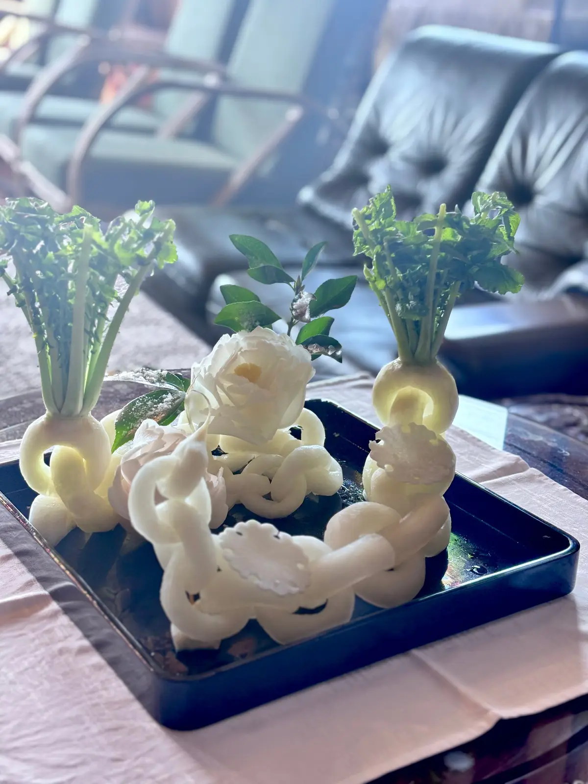 飾ってあるお花は花言葉の良いお花を庭から摘んで、飾ってくださったものだそう。
