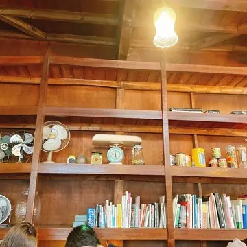 壁面にはレトロな小物達 昔の扇風機が並んでいたり、本が置いてあり落ち着いた空間