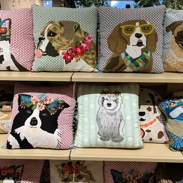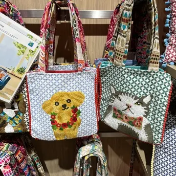 動物のイラストのバッグやクッションカバーがとても可愛くて目が行きました。