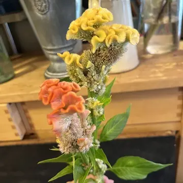 ケイトウが入ってはいるけど、モカラを目立たせるように と先生が言っていたので、ケイトウはちょこっと見えて、モカラがよく目に入るよう束ねました。