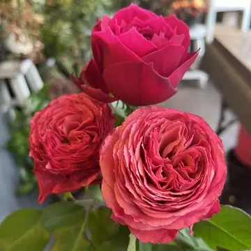 赤系のバラが目に入ったので1番に選び、同系色のカラー、あとは先生オススメのダリア、秋と言えばケイトウ、その他グリーン数種類と束ねることにしました。