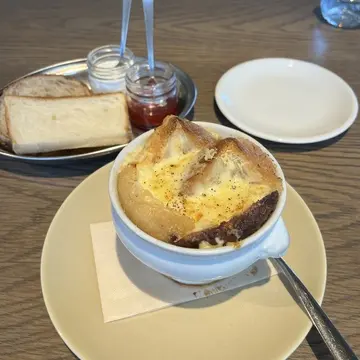 迷いに迷ってオニオングラタンスープにしました。