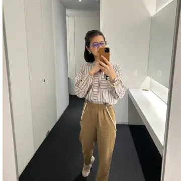 バンドカラーのピンクとグレーのストライプブラウスで、シンプルコーデにアクセントを。