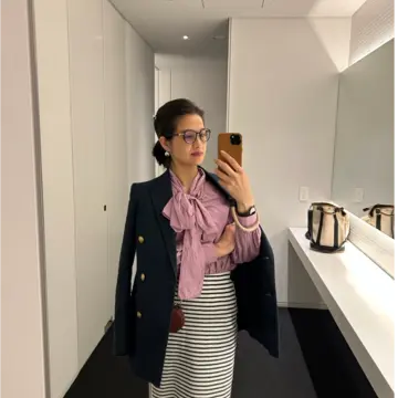 くすみピンクのリボンブラウス➕ボーダーのタイトスカート。