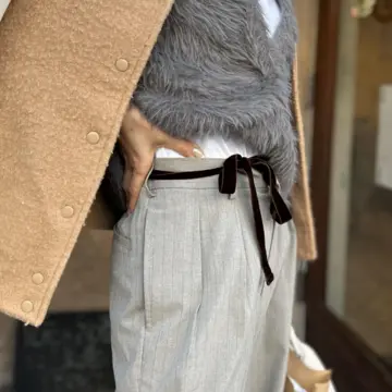 グレーのスラックスに薄いピンストライプデザインのパンツに、ベルベットのリボンが付いていて、衝撃的な出会いをしました。