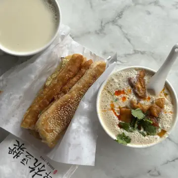 温めた豆乳にお酢の作用でフワフワなおぼろ豆腐のようになった豆乳に揚げパンとパクチーと辣油が入っているものです。辣油とパクチーが豆乳とマッチして豆乳が少し苦手な私でも食べやすかったです。