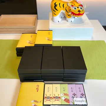 ショッパーの線とトラの繰り返しは何なんだろ?と常々、気になってはいましたが、お菓子を献上する際の重箱の線だったのねー☆