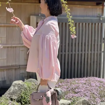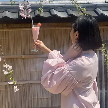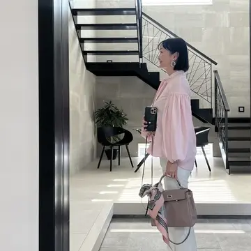 ピンクのブラウス、バッグ、スカーフ、いちごミルクのドリンクでピンクづくし🩷