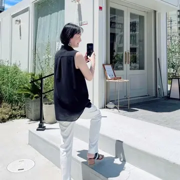 ネイビーのノースリーブトップスと最近ヘビロテのLE PHILの前スリットのホワイトパンツを合わせて。きちんと感を出しながらも涼しげに。