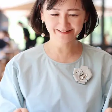 フランスのボタンやパーツを組み合わせたブローチをアクセントに。