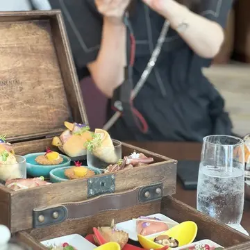 木箱にお行儀よく並べられたセイヴォリーとスイーツたち。