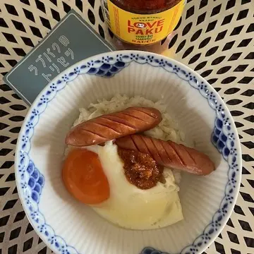 とりあえず一番簡単な食べ方、白ご飯にウインナーと目玉焼きで(^^♪