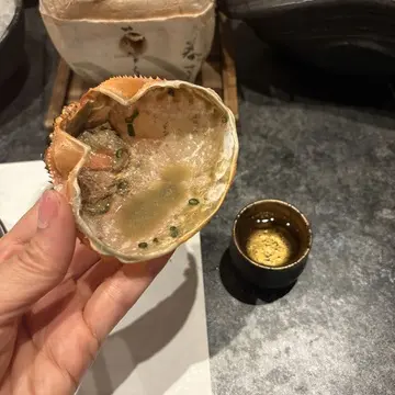 ニの甲羅に残った味噌に日本酒を注ぎ、