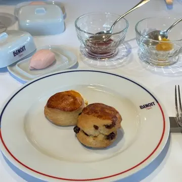 フワフワのスコーン、美味しかったです!添えられているのは、ジャムとホイップバターです。