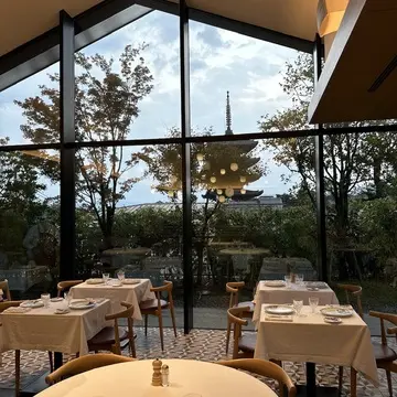 アンティークの家具やカウンター、赤いソファーが印象的な店内でした。ガラス張りのお席から見るお庭や八坂の塔、この景色を眺めながらお食事できるなんて、席に着いただけで心踊る気分になりました。