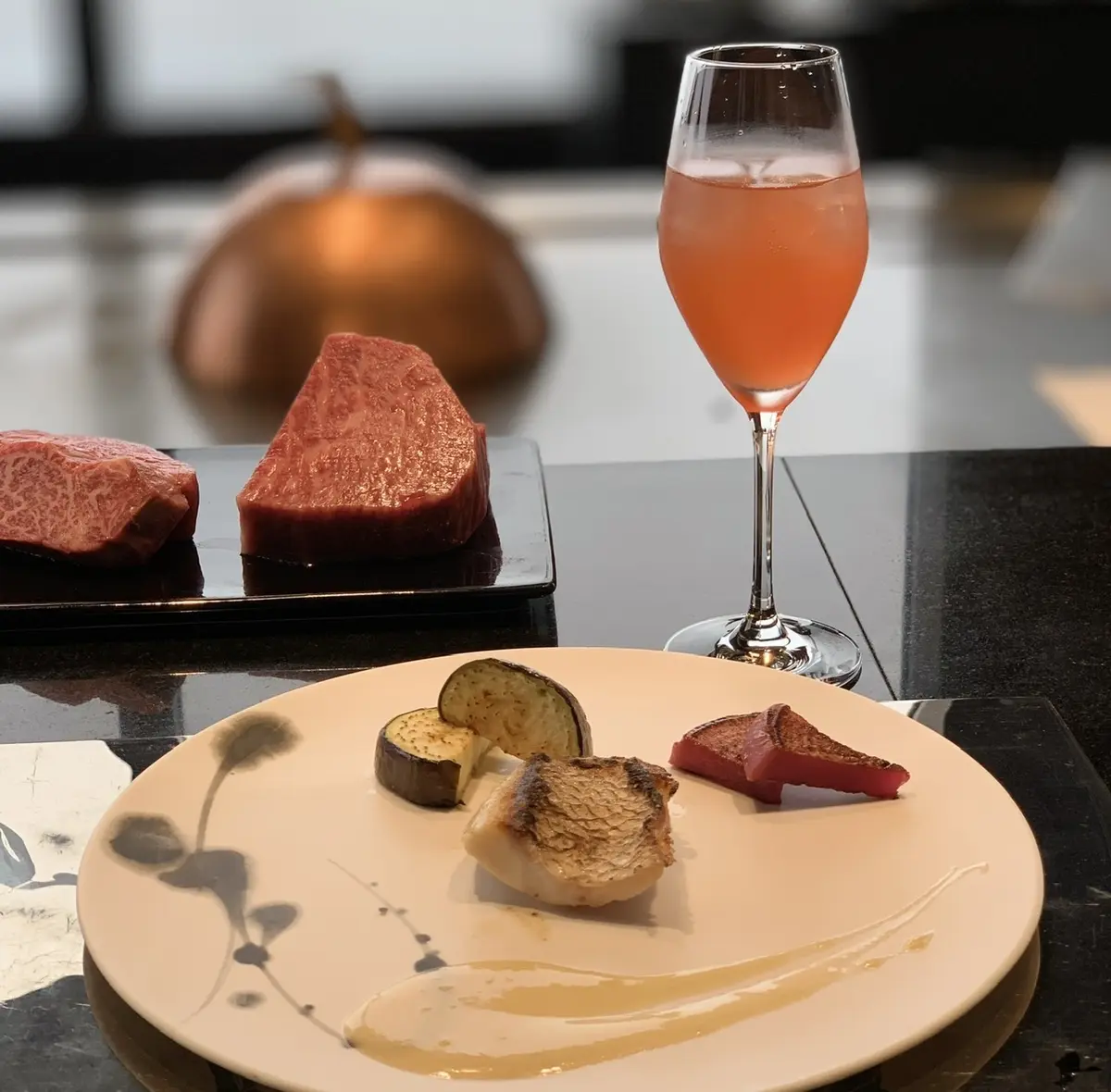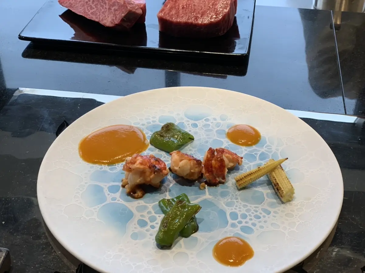 皆んな電車だったので、それぞれにドリンクを頼んでカンパーイ。綺麗な器と美味しいお料理で、話も弾みます。目の前で調理されていく食材と、鉄板焼ならではの、ライブ感で次のお料理が楽しみでたまりませんでした♬