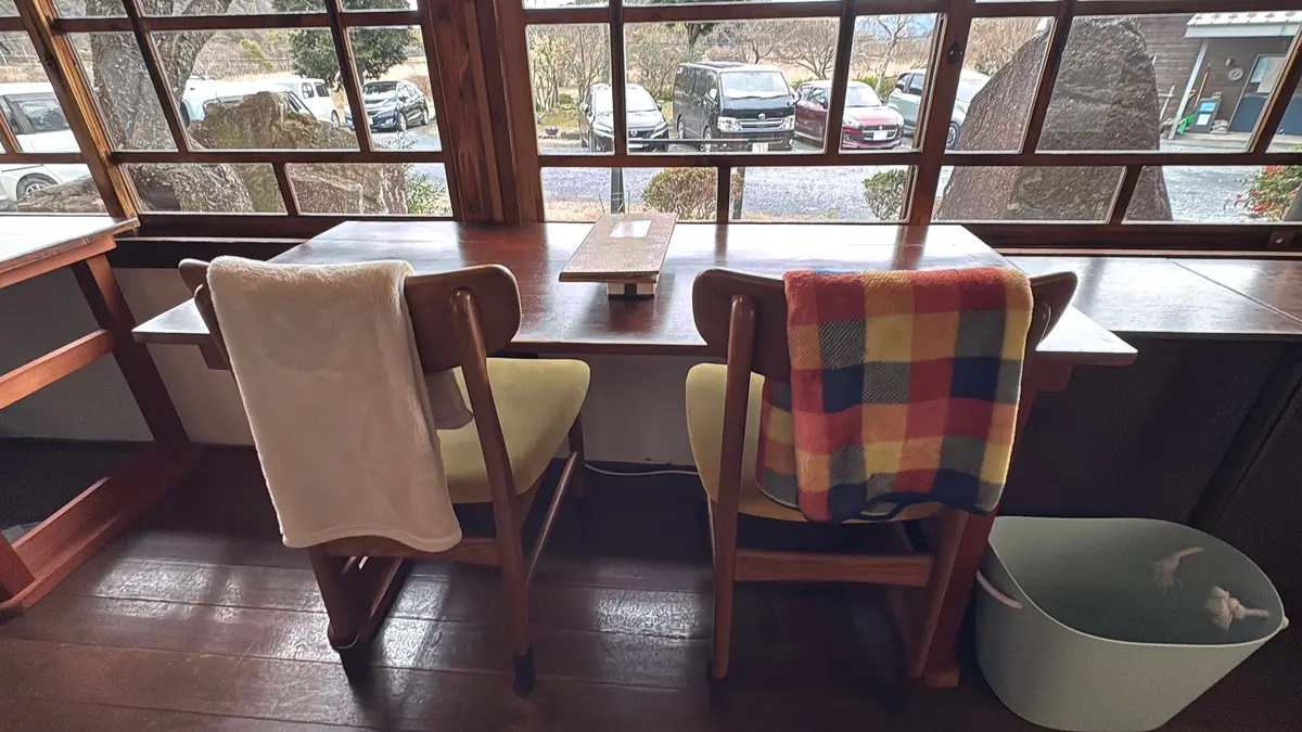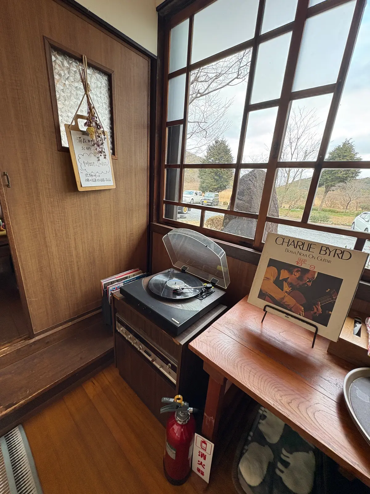 中に入ると、木の温もりに包まれたどこか懐かしい空間。レコードプレーヤーや古い家具、季節の飾りがさりげなく置かれていて、まるで昔の家に遊びに来たような落ち着いた雰囲気です。大きな窓からはのどかな景色が広がり、時間がゆっくり流れていくのを感じながら過ごせます。