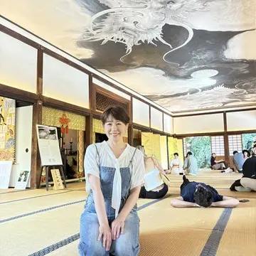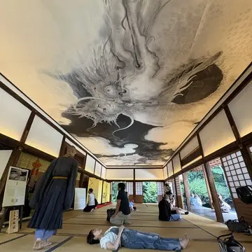 さらに歩き進めると、建仁寺の塔頭寺院 西来院(せいらいいん) にたどり着いた。ここには天井いっぱいに描かれた 白龍図 があって、作者は中国のアーティスト・ 陳漫(Chen Man) さん。東西約13メートル、南北約6メートルの大スケール。2頭の龍が本堂の空間を支配しているようなアート感に、思わず寝転んで見上げたくなるような迫力。実際寝てみるのを推奨されてるんです笑笑