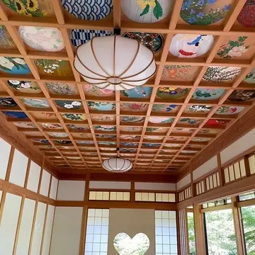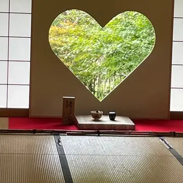 ハート形の窓からは四季折々の景色が楽しめます。天井画も素敵。