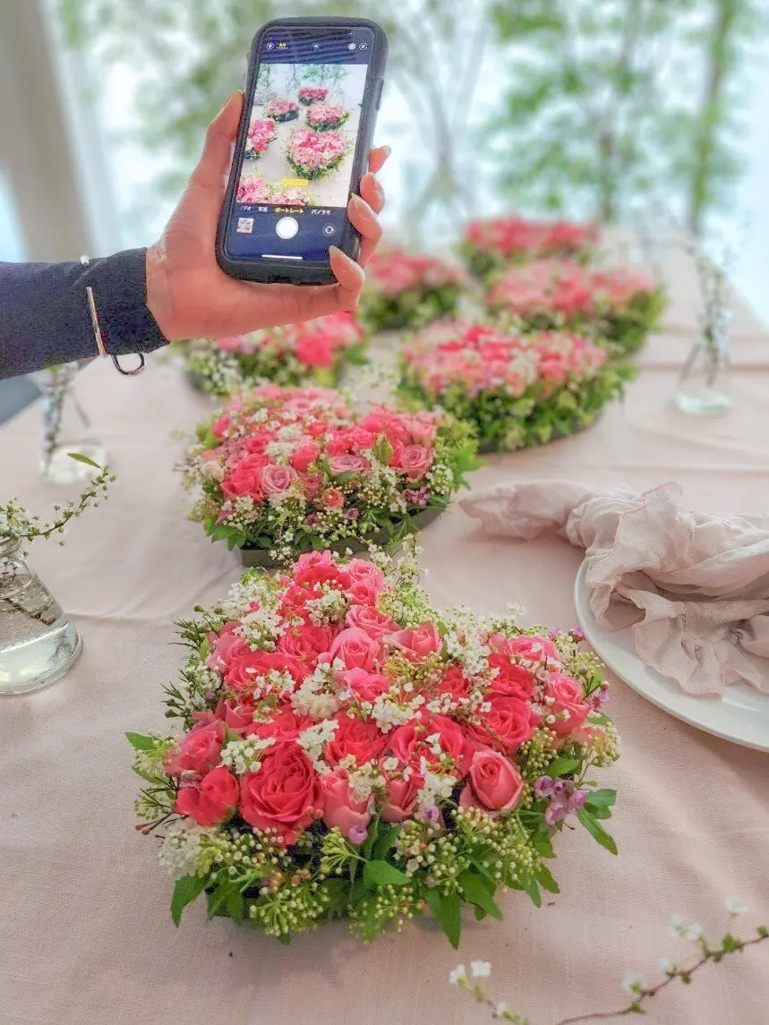 1人1台用意されたテーブルには、ハート型のオアシス台、花材 (濃淡のあるスプレー薔薇、雪柳、小手毬、ワックスフラワー) が用意されていました。