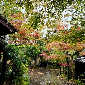 露天風呂へ向かうホテル敷地内も紅葉していてとってもいい雰囲気。ここは、プリンが絶品なのですが、現在は宿泊者のみの提供ということで断念。