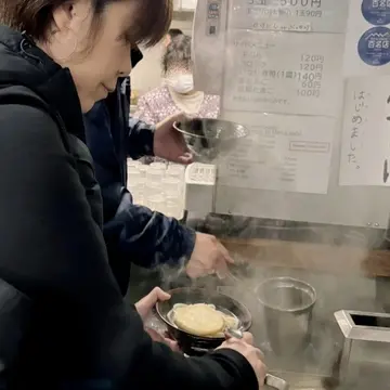 セルフで麺を茹でて、真ん中にあるお出汁を入れます。ネギ、生姜、天カスもセルフで。茹ですぎ注意!