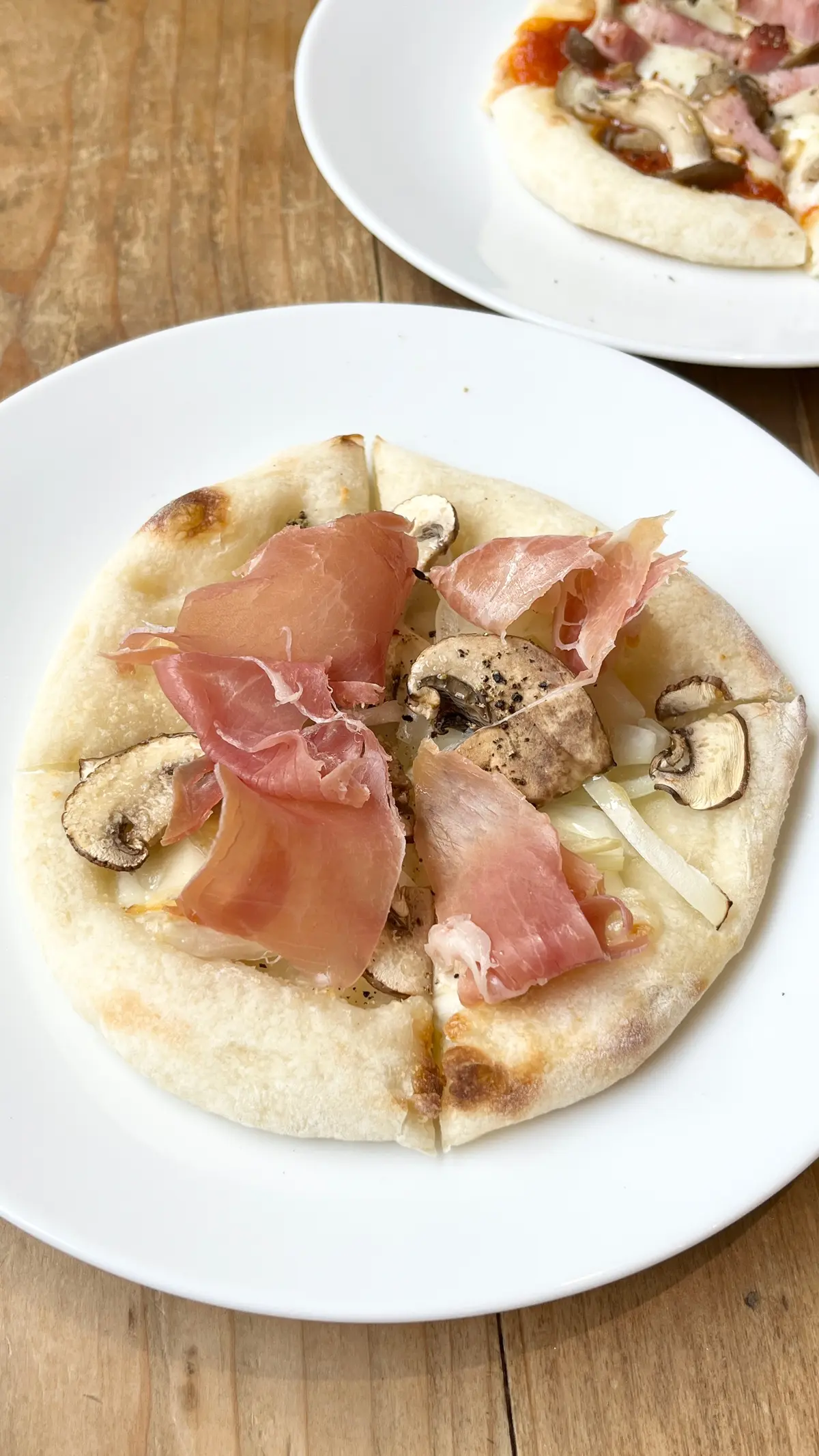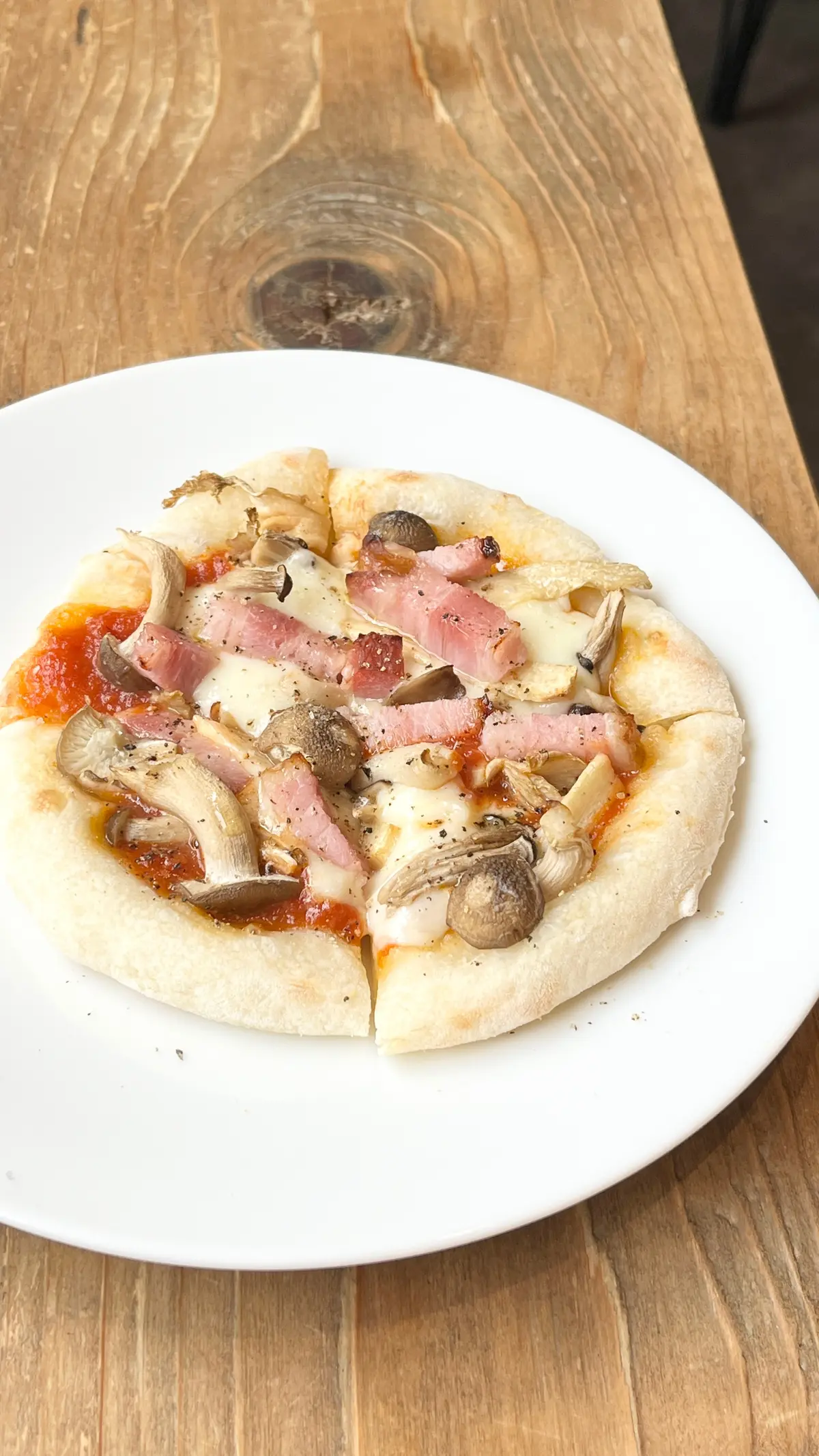 ここの人気はこのピザで、友人はキノコとベーコンのトマトソース、私は生ハムとマッシュルームに黒胡椒をチョイス。
