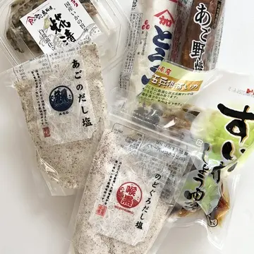1枚目は、のどぐろやあごの塩に、地元の人におすすめされた「ちくわ豆腐」と「あご野焼き」、あとはいかの麹漬けに、すいかのお漬物。