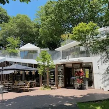 フランスの田舎を思わせるような緑眩しい中庭を抜けるとテラス席とエントランスが見えます。