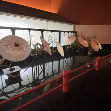 中庭や館内に配された大きな赤い番傘は、浴衣映えの王道アイテム。