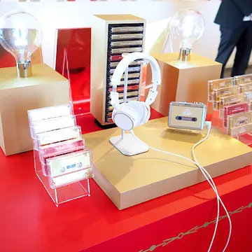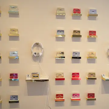 プレイリストをその場で視聴できるカセットテーププレイヤーや、曲の歌詞が音楽とともにディスプレイされるジュークボックスなどが設置されていて、レコードショップのよう!