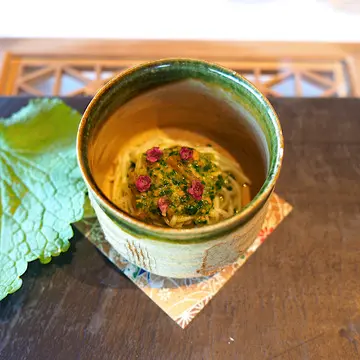 郡上山葵の味わいの和泉素麺のジェノベーゼ。ピリッと辛口。