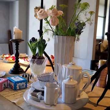 エレガントな食器とクロスのアンティークミックスは、真似したくなる可愛らしさです。