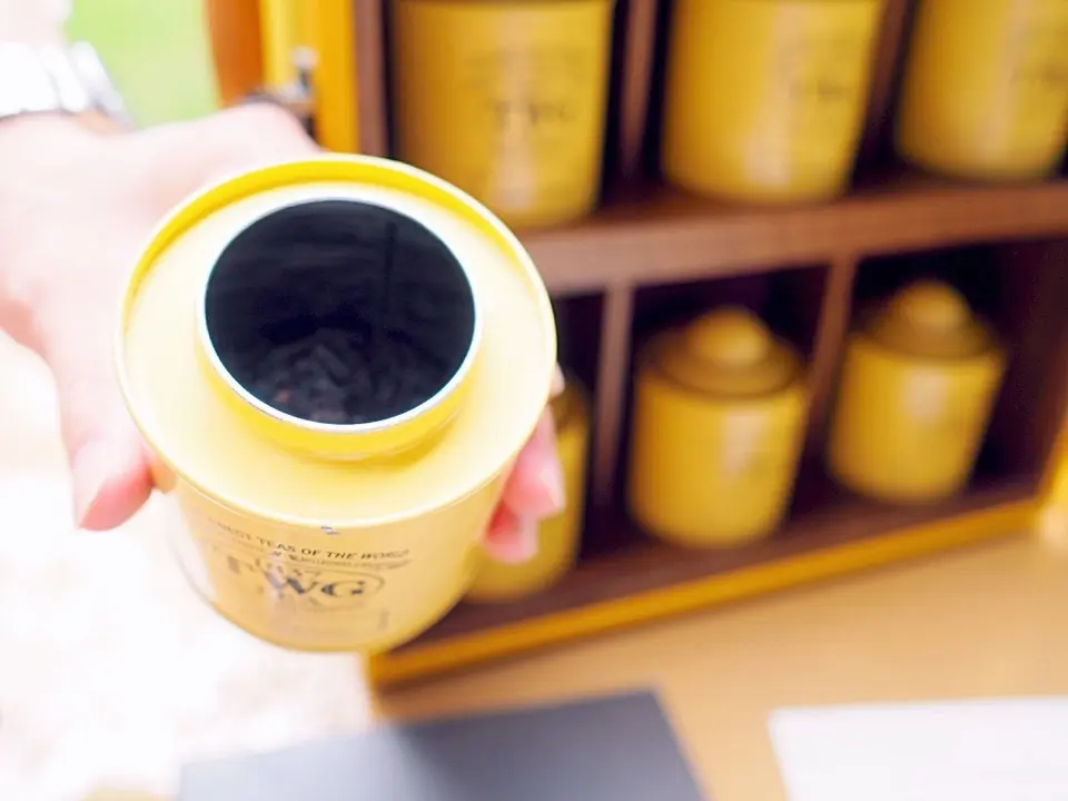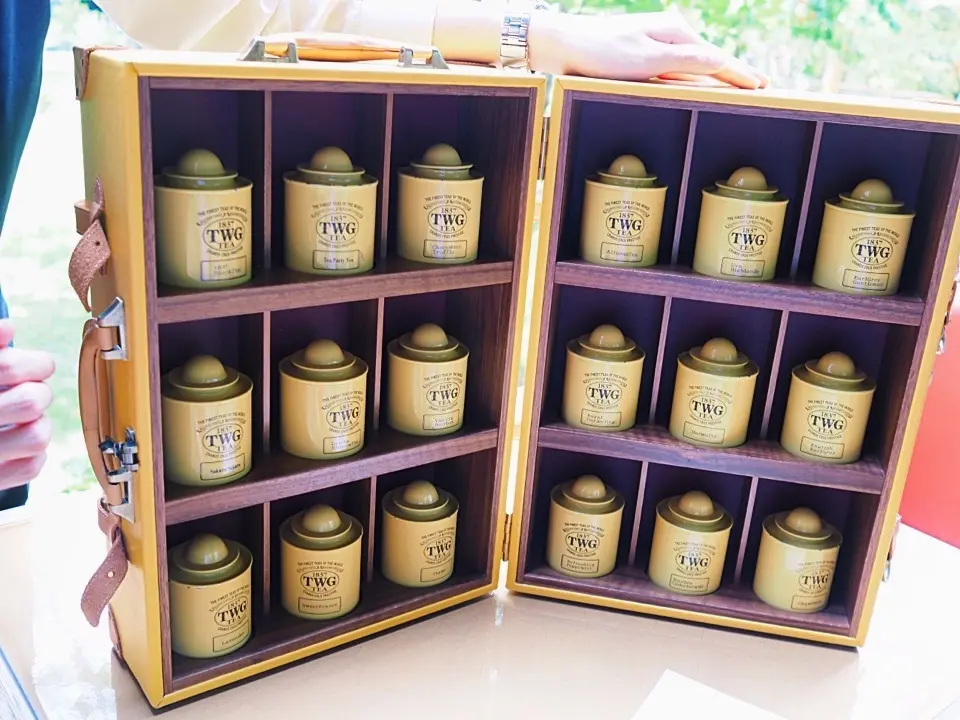 お茶はシンガポールのティーブランド、TWG Tea。特注のラゲッジケースにずらりと並ぶ茶缶を手に取り、香りを確認しながら茶葉を選んでいきます。