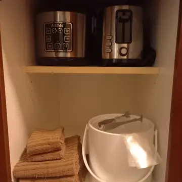お部屋には、ミニミニキッチン、電子レンジ、炊飯器がついているので、軽い自炊は出来ます。